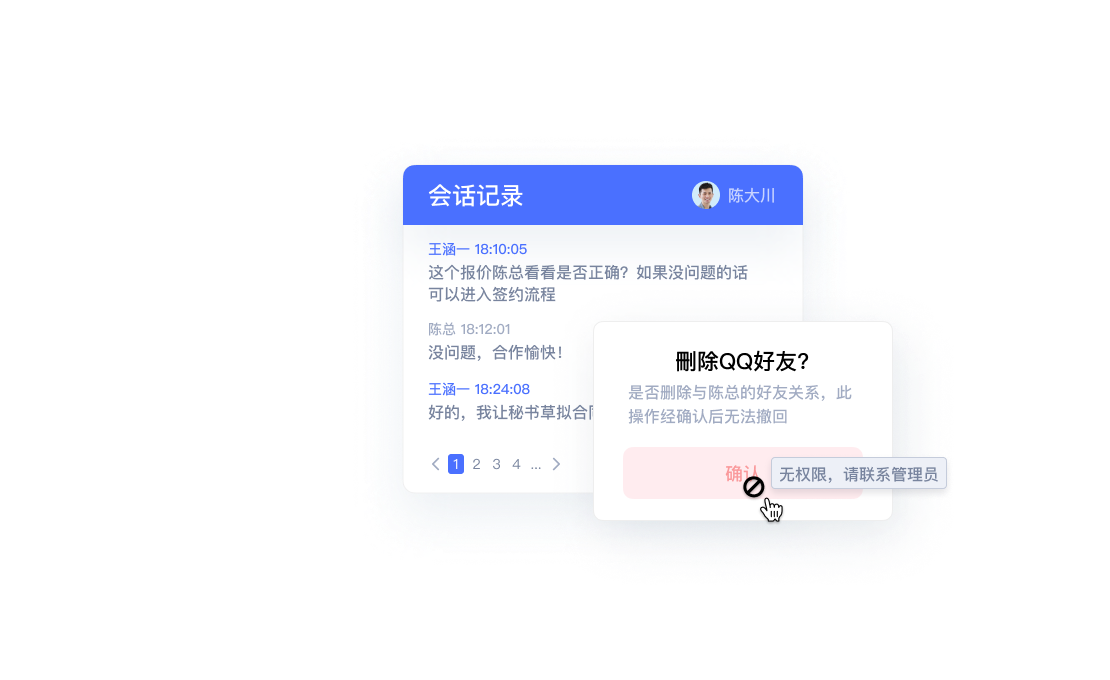 操作权限未经授权员工无法删除好友、退出或解散群,客户资源完全归企业所有
