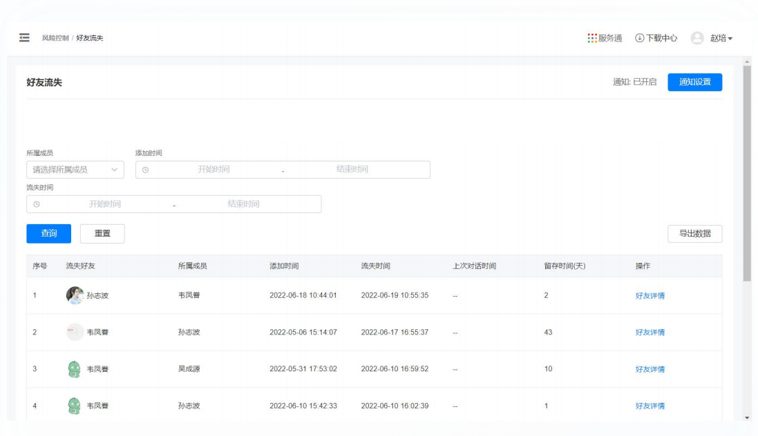 记录客户流失的数据情况,被客户删除时实时预警,